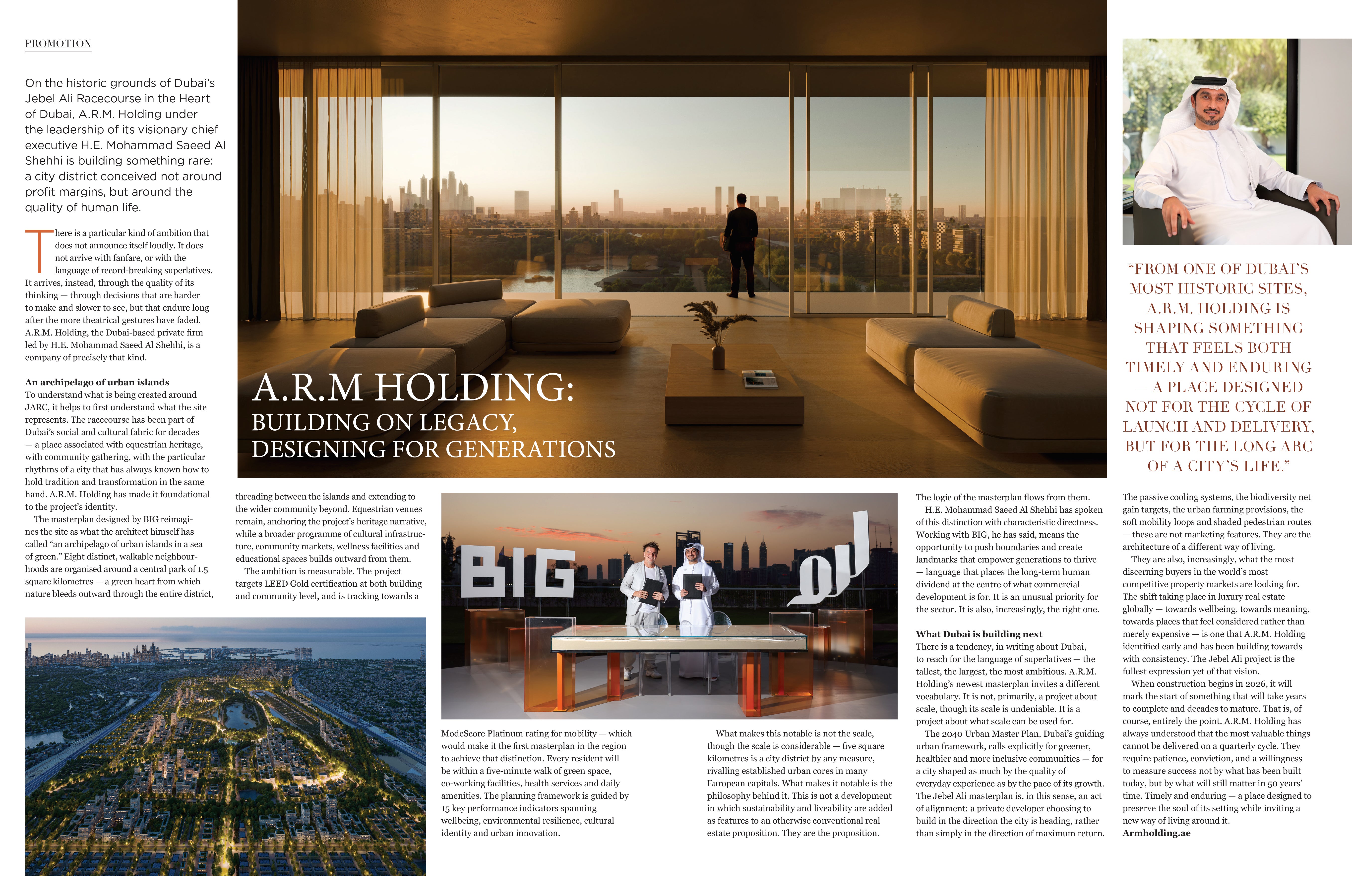 The feature explores the Group’s latest masterplan on the historic grounds of Jebel Ali Racecourse, a transformative city district designed not around conventional development metrics, but around the quality of human life. Guided by long-term thinking and purposeful design, the project reflects A.R.M. Holding’s commitment to creating environments that endure beyond immediate returns.